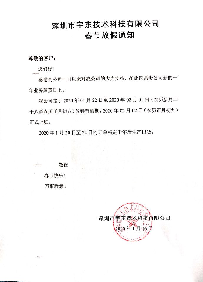 YUOUT 宇東技術 2020年春節放假通知!
