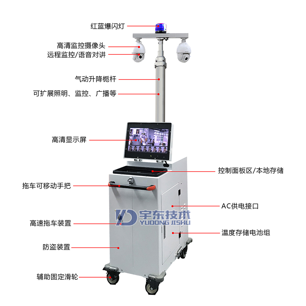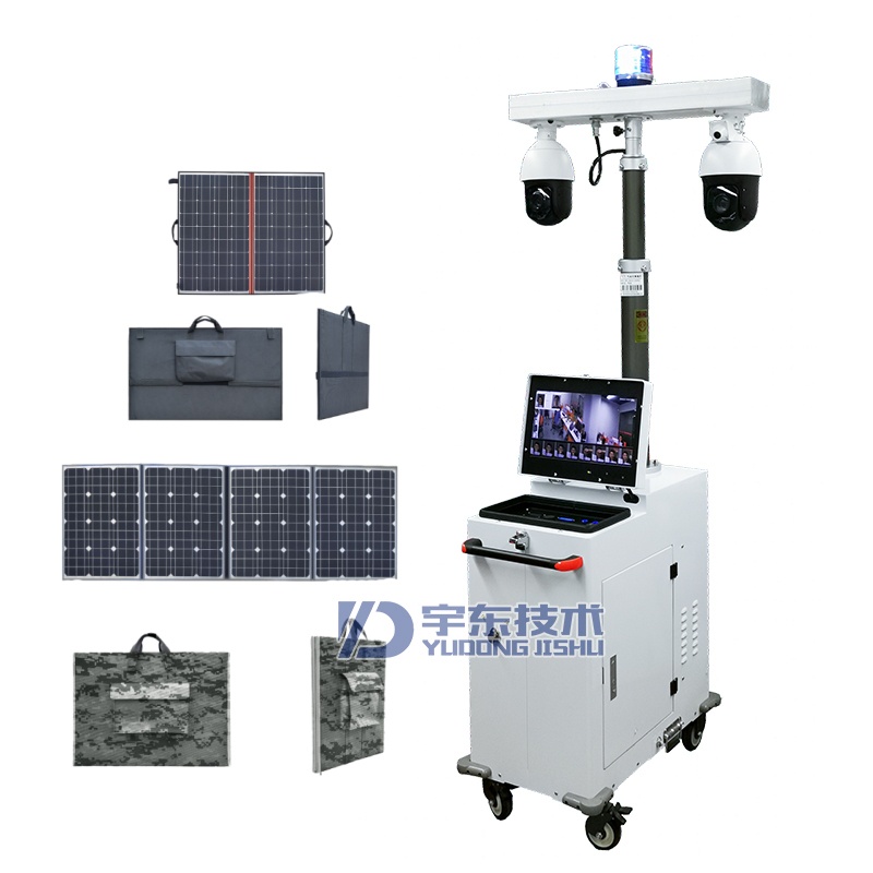 神盾X2plus 4G便攜式移動監控主要有攝像機、升降系統、傳輸系統、車體等4部分組成、安裝方便、操作簡單一體化設計,機身靈活,帶有拖動輪胎,便于布防和移動;一體式伸縮支架,方便固定;監控桿體可升降、搭載高清360°旋轉的攝像頭;支持wifi/3G/4G無線網絡信號傳輸;自帶揭蓋式顯示屏,方便本地查看;內置1組蓄電池,可續航24H(根據電池大小);定制化功能,支持人流管控、溫濕度監控、揚塵監控等功能