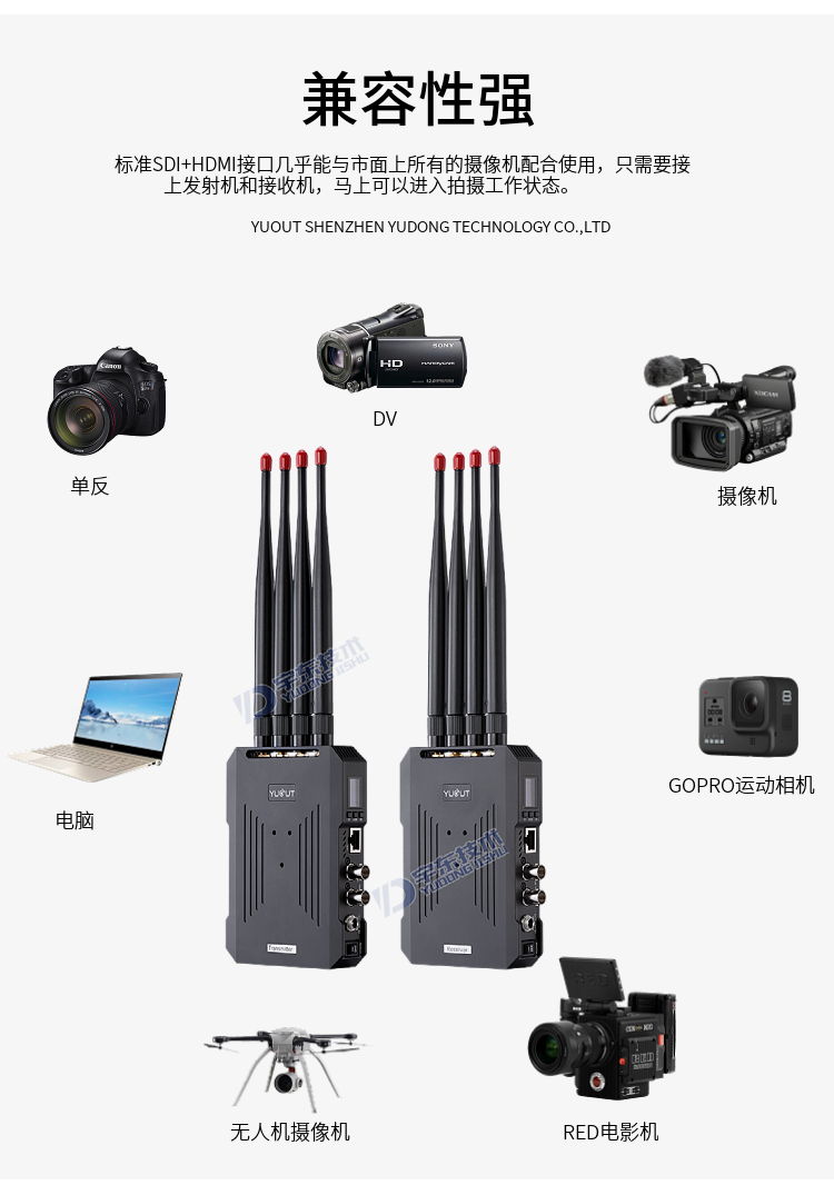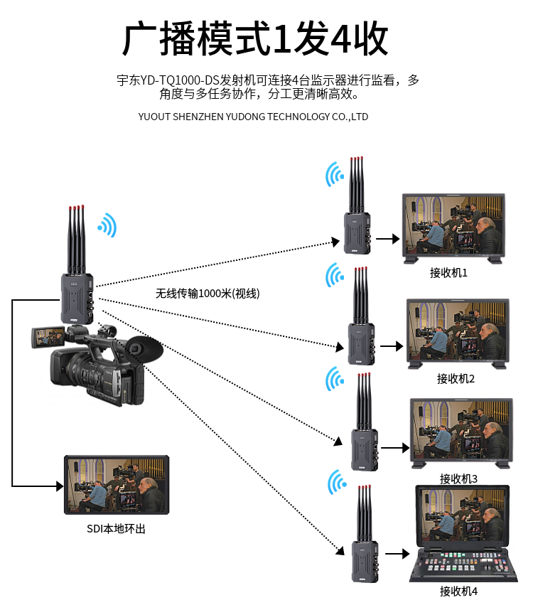 YD-TQ1000-DS是由發(fā)射端和接收端組成,支持3G/HD/SD-SDI或者HDMI 1080P全高清信號傳輸,作為圖傳時,視線無阻擋傳輸距離1000至1500米。頻段采用5.1-5.8GHz,支持用戶手動通信頻點調(diào)整,為發(fā)射端和接收端配對,還支持廣播模式,可以把多個接收端設(shè)置成跟一個發(fā)射端相同的頻點,實現(xiàn)一發(fā)多收。純硬件連接操作,簡單可靠。設(shè)計精巧,可以F970 、V口、 電源適配器三種供電方式,方便移動拍攝。廣泛應(yīng)用于電影拍攝、應(yīng)急搶險、消防、人防、武警、突發(fā)事故單兵視頻采集等場合;真正實現(xiàn)高清無線傳輸、移動實時傳輸、