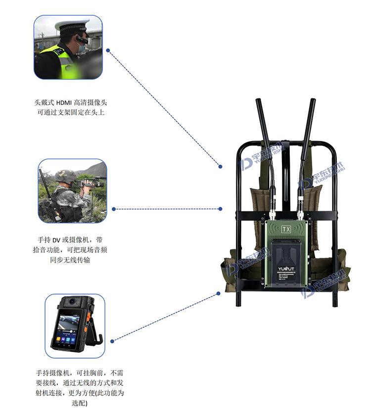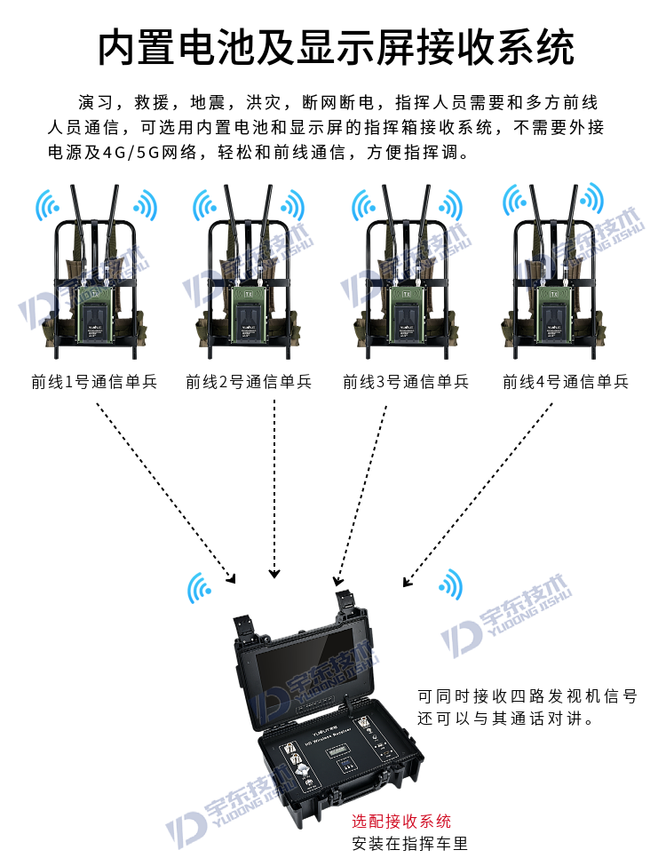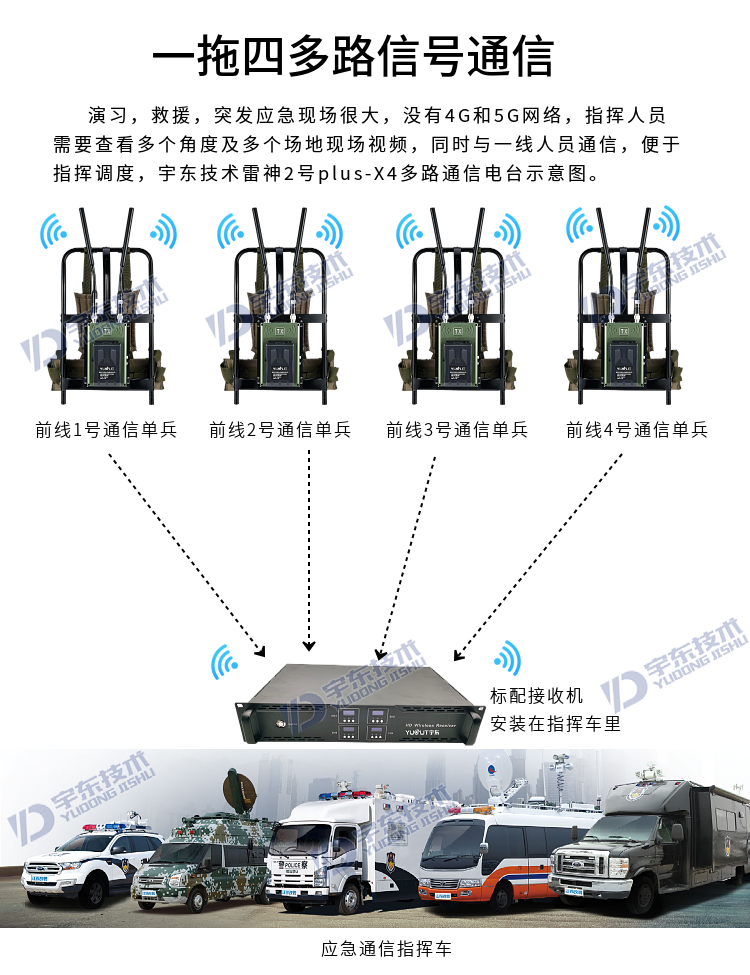 宇東技術(shù)雷神2號(hào)plus-X4一拖四背負(fù)式高清無(wú)線(xiàn)圖傳電臺(tái),是應(yīng)對(duì)突發(fā)事故,斷網(wǎng)斷電,如地震、洪災(zāi)、反恐、應(yīng)急救援、部隊(duì)演習(xí)等使用通信,本設(shè)備由4路背負(fù)式單兵發(fā)射機(jī)電臺(tái)和1臺(tái)四路接收于一體的接收電臺(tái)地面指揮箱組成,指揮箱自帶四路接收模組和顯示器及功能按鍵,可同時(shí)接收四路發(fā)射機(jī)的視頻和對(duì)講信號(hào)數(shù)據(jù),指揮箱自帶揚(yáng)聲器,可接收DV無(wú)線(xiàn)發(fā)送現(xiàn)場(chǎng)的聲音數(shù)據(jù)。支持?jǐn)U展HDMI外接顯示大屏及插USB錄像保存功能,真正義意上做到及時(shí)取證,錄像保存,移動(dòng)通信,統(tǒng)計(jì)指揮調(diào)度等。