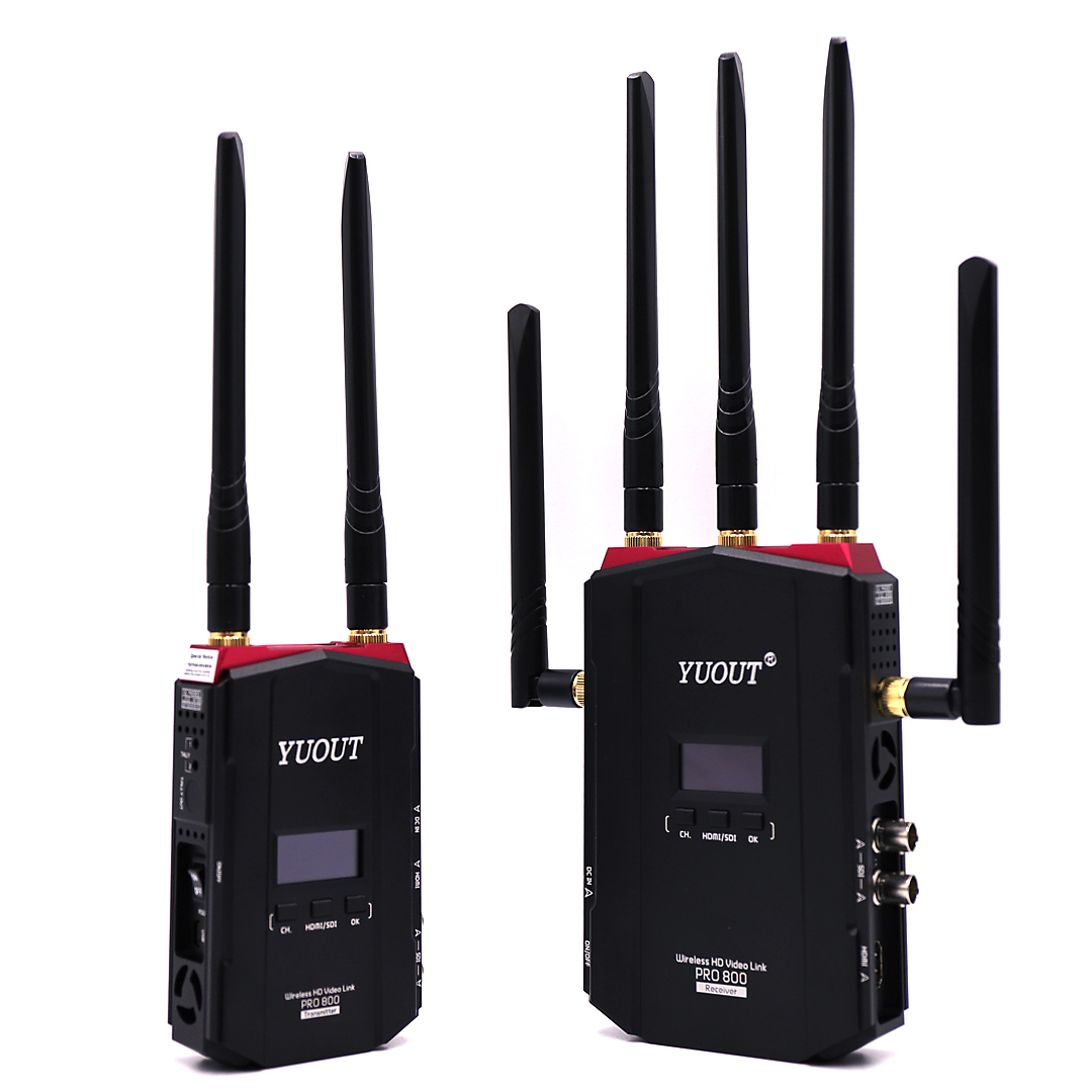 PRO800系統采用5.1GHz-5.9GHz無線頻率,發射器和接收器的正面,預留了手動通信頻點選擇按鈕,用戶可以通過“CH”按鈕進行通信頻點調整,在同一環境下最多支持8套設備同時工作。多個移動機位方便對全場景拍攝,免去視頻扯線的煩惱,攝影師可以自由移動。